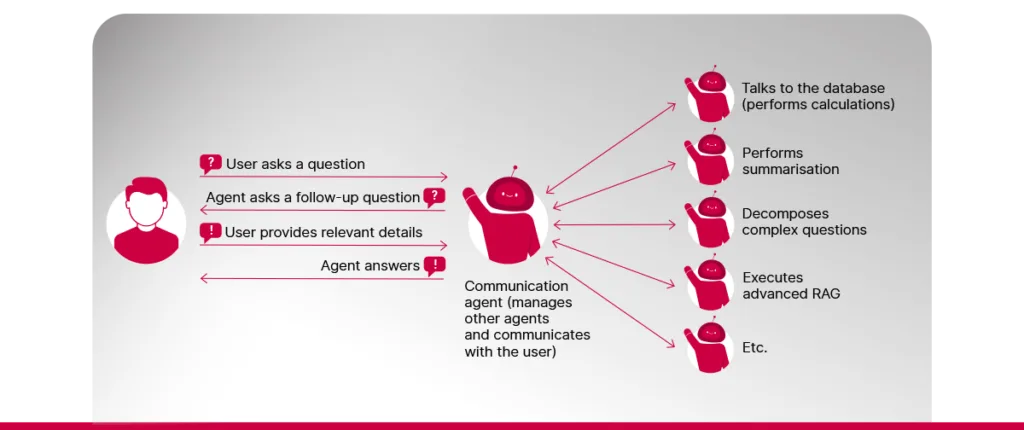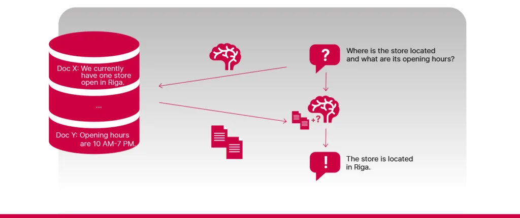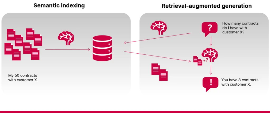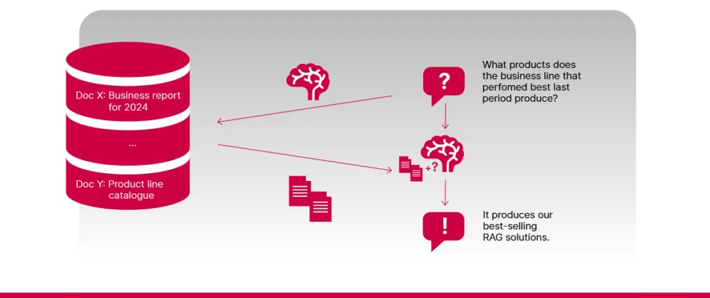 Hereâs an example of how it works. Imagine you have a huge pile of company documents, and you need to find the one report that lists your top-selling products from five years ago. Instead of searching through everything yourself, you have a smart assistant who finds the right report, reads it and gives you a clear, accurate answer in seconds.